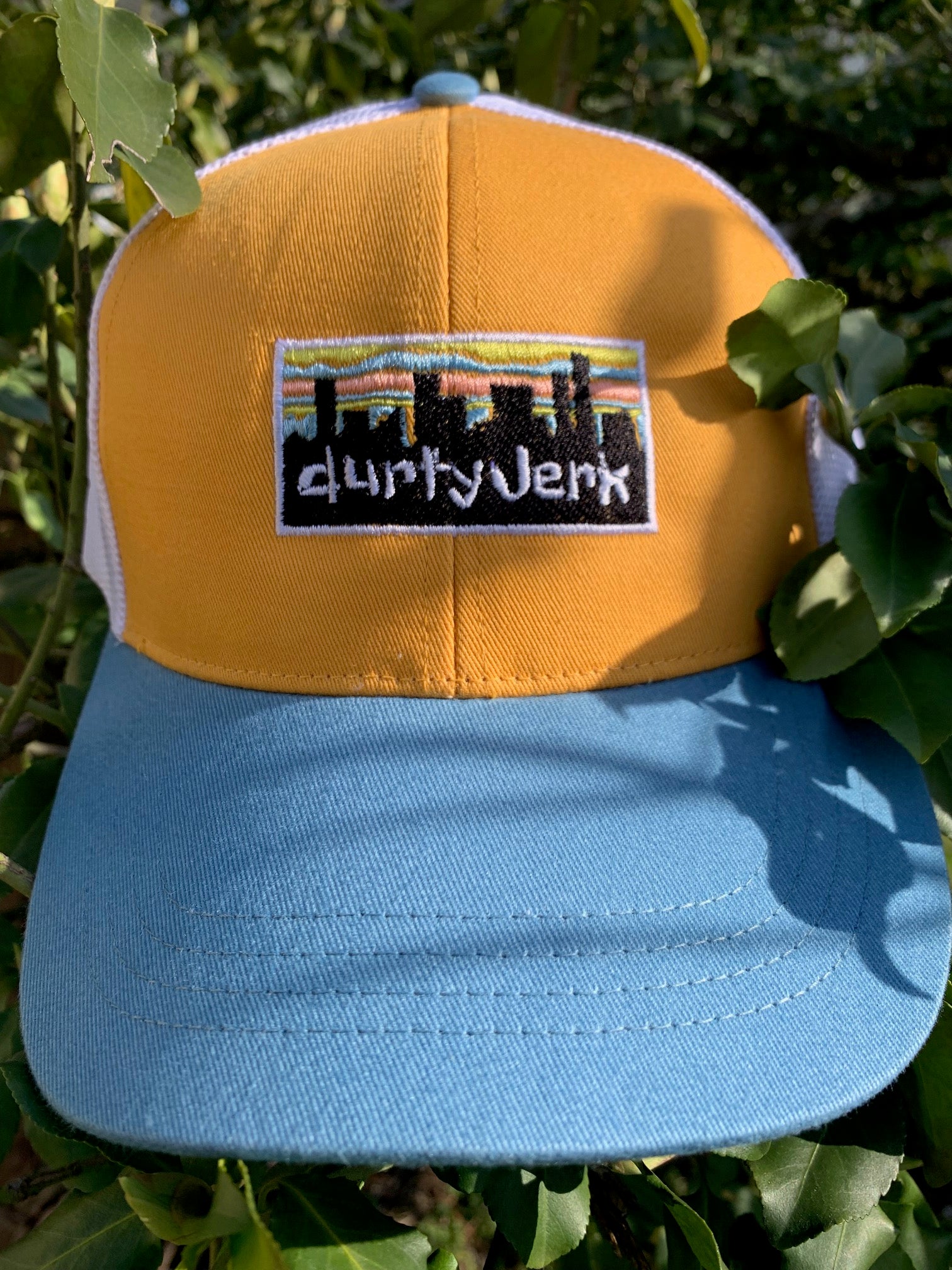 yellow front, light blue bill, white mesh, snapback hat.