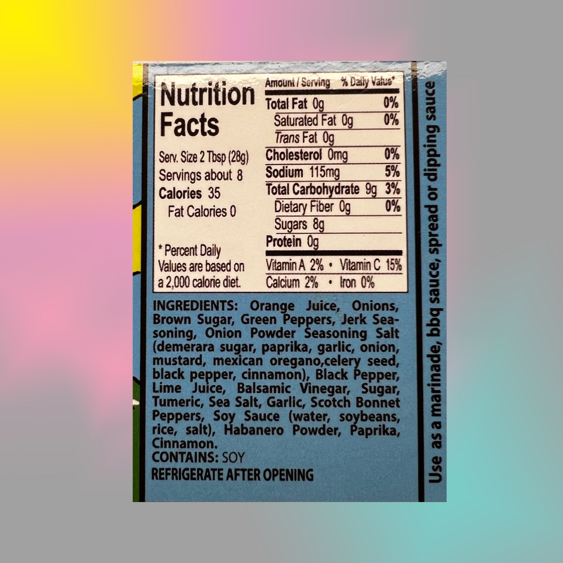 Orange juice, Onions, Brown Sugar, Green Peppers, Jerk Seasoning, Onion Powder, Seasoning Salt (demerara sugar, paprika, garlic, onion, mustard, Mexican oregano, celery seed, black pepper, cinnamon), Black Pepper, Lime Juice, Balsamic Vinegar, Sugar Turmeric, Sea Salt, Garlic, Scotch Bonnet Peppers, Soy Sauce (water, soybeans, rice, salt), Habanero Powder, Paprika, Cinnamon.